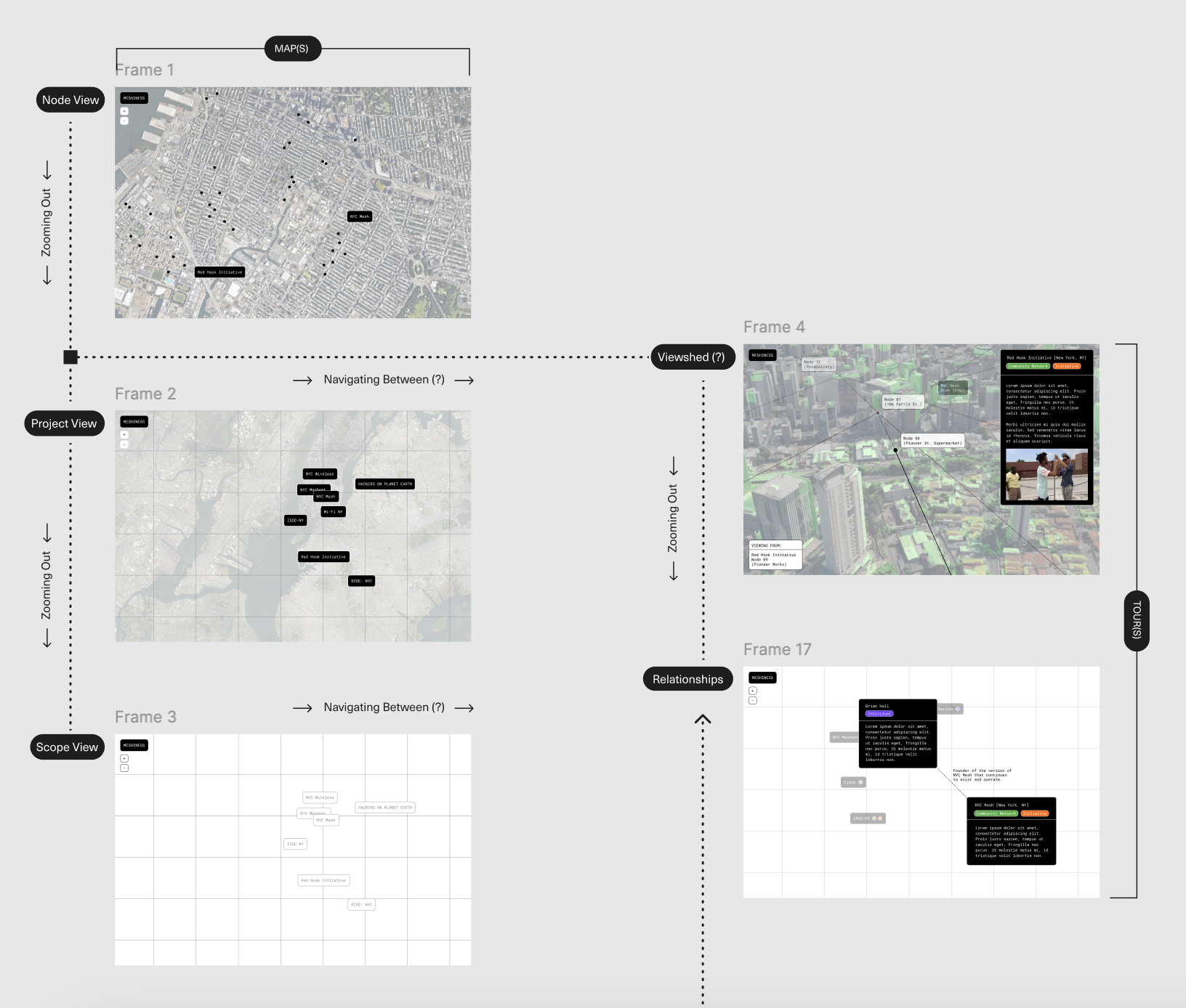 Collection of screenshots from the prototype of the interactive interface that will offer a visualization of select entries from the database, presently in development. The goal with this application is to allow the user to view "lines-of-sight" that cut across this database: conceptual framings that cause certain cases, sites, technologies, and people to coherently align along some conceptual dimension. The interface will be divided into two paradigmatic view: topological, consisting of a top-down traditional network diagram, and topographical, which will offer a line-of-sight view through some particular terrain. Users will be able to zoom in and out of each view, as well as navigating between views, and selecting specific nodes.